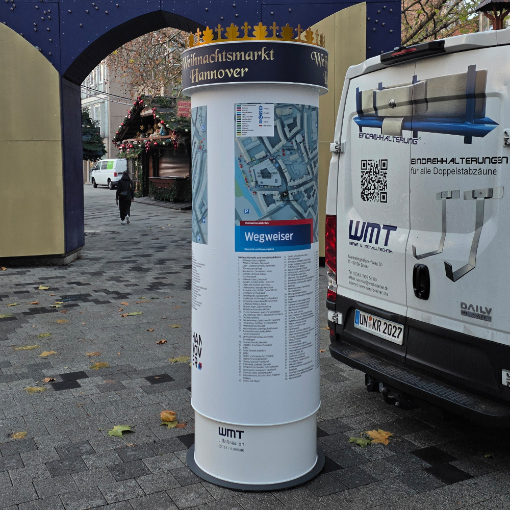 Als etablierter Hersteller von Litfaßsäulen mit über 30 Jahren Erfahrung fertigt WMT Werbe- und Metalltechnik robuste und vielseitige Werbesäulen für den Innen- und Außenbereich. Sie können bei uns Litfaßsäulen kaufen oder mieten – maßgeschneidert für Ihre Anforderungen in Städten, Gemeinden, Unternehmen, Schulen oder bei Events.