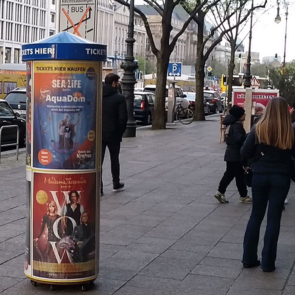 Litfaßsäulen Miete für alle Anlässe. In der Regel sind 15 - 30 Stück dieses Modells planbar. Bitte nennen Sie uns den Veranstaltungsort und Ihr Wunschdatum.Diese Litfaßsäule können sie ab 5 Stück Mindestabnahme mieten.