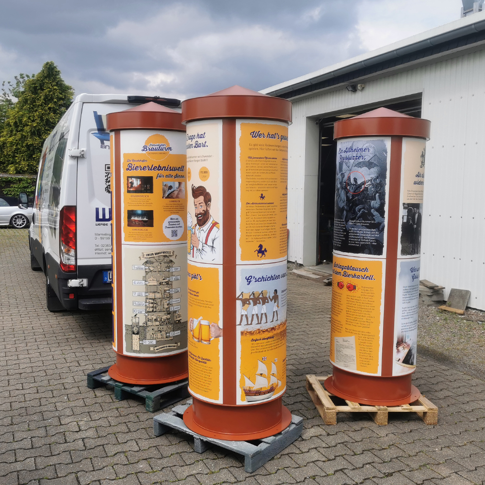 Hinweis: Wir liefern unsere Litfaßsäulen fix und fertig an einem Stück. Diese sind sofort Einsatzbereit. Eine Montage in Ihren Räumen entfällt in der Regel. Anlieferungen zu Messegeländen / Messeständen nur nach Absprache.