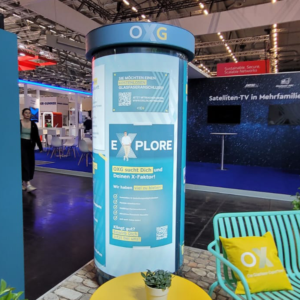 Litfaßsäule hinterleuchtet zur Miete - Bauhöhe 2,20 m Ø 83 cm, hinterleuchtet und mit Drehmotor ausgestattet.