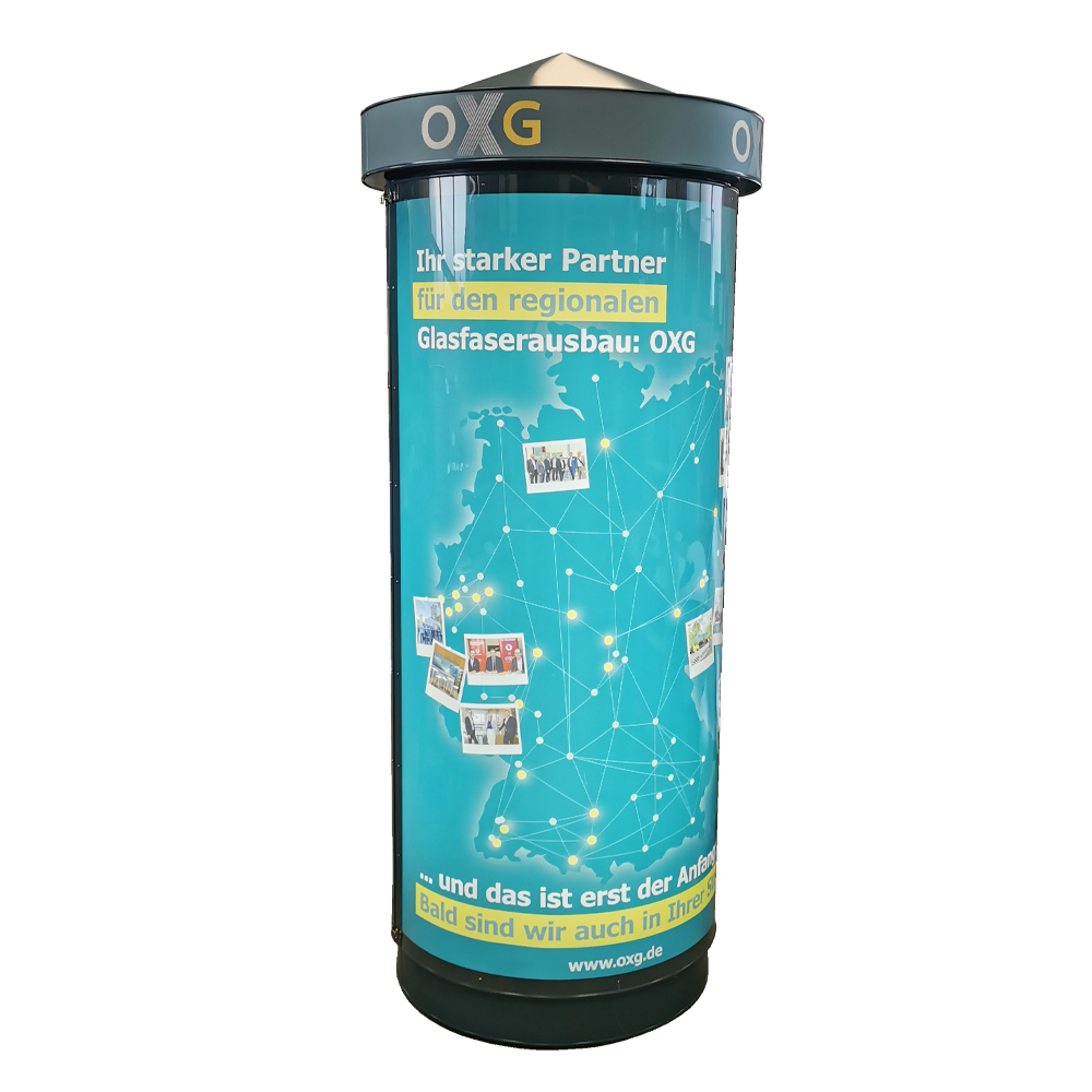 Hinweis: Wir liefern unsere Litfaßsäulen fix und fertig an einem Stück. Diese sind sofort Einsatzbereit. Eine Montage in Ihren Räumen entfällt in der Regel. Anlieferungen zu Messegeländen / Messeständen nur nach Absprache.